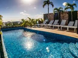 Rooftop infinity pool with pool chairs, outdoor chairs, views of Cozumel